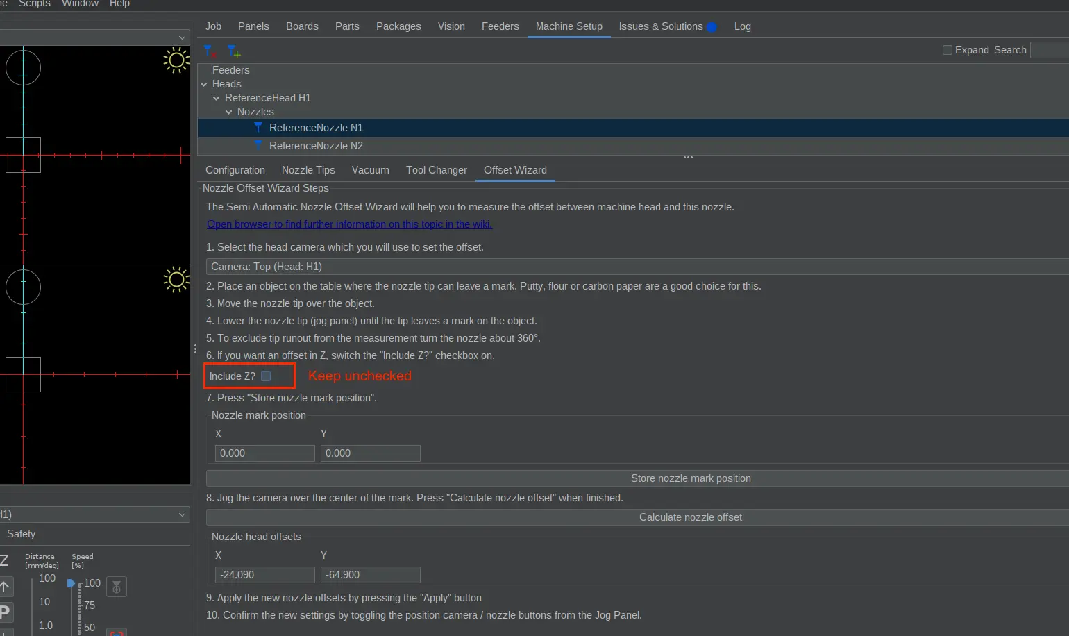 Include Z?checkbox is selected. This will find the difference between the primary fiducial's Z-height value and Nozzle N2's Z-height. Then adds the appropriate offset to Nozzle N2's Z-height.