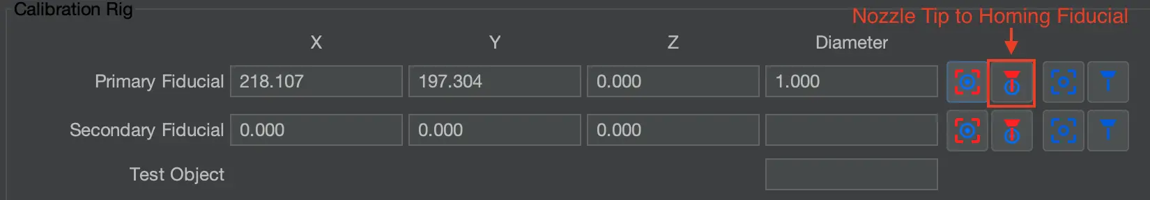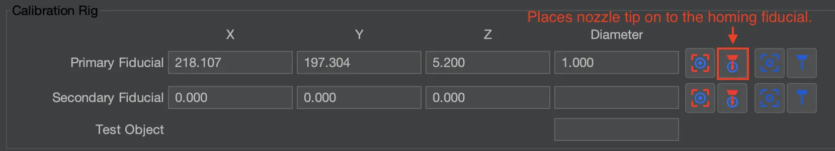 - Click the button to place the selected nozzle tip on the Homing Fiducial. It is directly beside the button used for the camera in step 1.