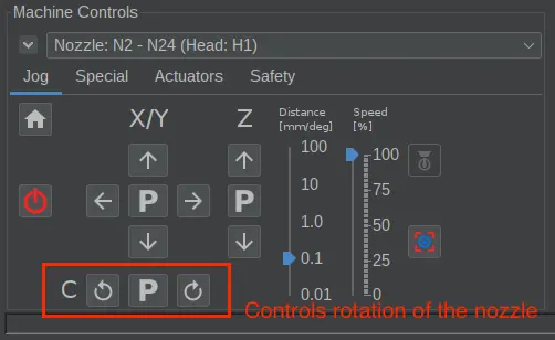 - Within Machine Controls (bottom left of OpenPnP),locate the rotational controls, which can be found below the main directional arrows. The rotational control is labeled "C" with a Park button in between its left and right arrows. This adjusts the rotation.
