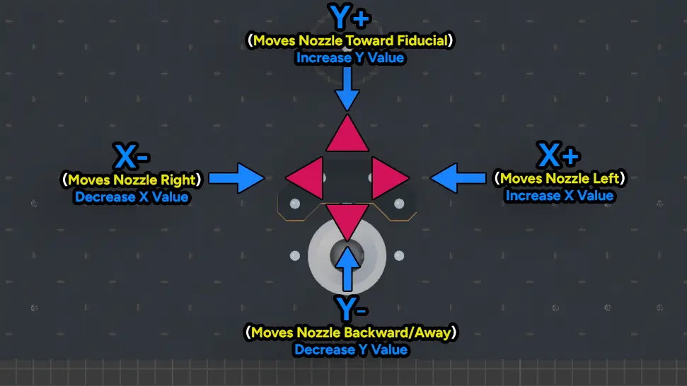 - When the nozzle tip does not land perfectly on the fiducial, adjust its offset.